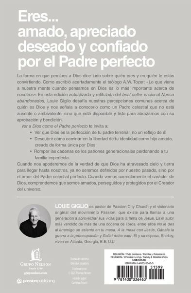 Ustedes son elegidos, amados, apreciados, queridos y creídos por un Padre perfecto. En Ver a Dios como el Padre perfecto, Louie Giglio nos invita a experimentar a Dios de una manera que transforma la vida: como un Padre perfecto que quiere que vivamos bajo la cascada de Su bendición. Cuando piensas en Dios, ¿te imaginas un dictador que exige lealtad absoluta o un entrenador que espera que cumplas con sus expectativas? ¿O incluso un asistente virtual para ayudar cuando se agotan otras opciones? Esta edición actualizada del éxito de ventas nacional Nunca olvidados desafía nuestra percepción de quién es Dios y nos señala a un Padre celestial que no está ausente ni es ambivalente, sino que está disponible, es afectuoso, y está listo para colmarnos de Su aprobación y amor. No importa lo que haya pasado de este lado de la eternidad entre tú y tu padre terrenal, Ver a Dios como el Padre perfecto te ayudará a: * Aceptar quién es Dios y descubrir la verdad y la belleza de Su naturaleza * Entender que Dios te creó de manera única y te ama incondicionalmente * Desatar las cadenas que te mantienen cautivo y encontrar la libertad en quién eres en Cristo * Caminar en la plenitud, la autoridad y la intimidad de un hijo de Dios Cuando nos aferremos a la verdad de que nuestro Dios ha atravesado el cielo y la tierra para alcanzarnos, ya no seremos definidos por nuestro pasado, sino por el amor de un Padre perfecto. Aprende cómo Dios quiere que experimentemos Su amor único e incondicional y que vivamos en la libertad, la abundancia y la bendición que El da gratuitamente. Seeing God as a Perfect Father You are chosen, loved, prized, wanted, and believed in by a perfect Father. In Seeing God as a Perfect Father, Louie Giglio invites us to experience God in a life-changing way: as a perfect Father who wants you to live under the waterfall of His blessing. When you think about God, do you imagine a ruler who demands absolute loyalty, or a coach who expects you to perform to his expectations? Or even a virtual assistant to help when other options are exhausted? This updated edition of the national bestseller Not Forsaken challenges our perception of who God is and points us to a heavenly Father who is not absent or ambivalent, but is available and affectionate, ready to shower us with His approval and love. No matter what has happened on this side of eternity between you and your earthly dad, Seeing God as a Perfect Father will help you: * Embrace who God is and discover the truth and beauty of His nature * Understand that God uniquely created you and loves you unconditionally * Unlock the chains holding you captive and find freedom in who you are in Christ * Walk in the fullness, authority, and intimacy as a child of God When we take hold of the truth that our God has spanned heaven and earth to reach us, we will no longer be defined by our past but by the love of a perfect Father. Learn how God wants us to experience His unique, unconditional love and to live in the freedom, abundance, and blessing He freely gives.