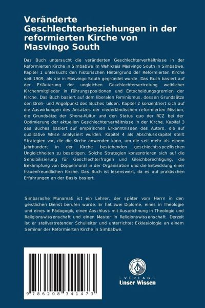 Das Buch untersucht die veränderten Geschlechterverhältnisse in der Reformierten Kirche in Simbabwe im Wahlkreis Masvingo South in Simbabwe. Kapitel 1 untersucht den historischen Hintergrund der Reformierten Kirche seit 1909, als sie in Masvingo South gegründet wurde. Das Buch basiert auf der Erläuterung der ungleichen Geschlechtervertretung weiblicher Kirchenmitglieder in Führungspositionen und Entscheidungsgremien der Kirche. Das Buch basiert auf dem liberalen Feminismus, dessen Grundsätze den Dreh- und Angelpunkt des Buches bilden. Kapitel 2 konzentriert sich auf die Auswirkungen des Ansatzes der niederländischen reformierten Mission, die Grundsätze der Shona-Kultur und den Status quo der RCZ bei der Optimierung der aktuellen Geschlechterverhältnisse in der Kirche. Kapitel 3 des Buches basiert auf empirischen Erkenntnissen des Autors, die auf qualitative Weise analysiert wurden. Kapitel 4 als Abschlusskapitel stellt Strategien vor, die die Kirche anwenden kann, um die seit mehr als einem Jahrhundert in der Kirche bestehenden geschlechtsspezifischen Ungleichheiten zu beseitigen. Solche Strategien konzentrieren sich auf die Sensibilisierung für Geschlechterfragen und Gleichberechtigung, die Bekämpfung von Doppelmoral in der Organisation und die Entwicklung einer frauenfreundlichen Kirche. Das Buch ist lesenswert, da es auf praktischen Erfahrungen an der Basis basiert.