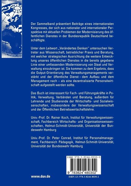 Unter dem Leitwort "Verändertes Denken" untersuchen Vertreter aus Wissenschaft, betrieblicher Praxis und Beratung, mit welcher strategischen Ausrichtung die weitere Entwicklung unseres öffentlichen Dienstes in die bereits gegebene Linie einer umfassenden Modernisierung von Staat und Verwaltung einzubringen ist. Sie kommen zu dem Ergebnis, dass die Output-Orientierung des Verwaltungsmanagements verstärkt und der öffentliche Dienst - dem Aufbau und dem Management nach - als eine dezentralisierte Personalwirtschaft aufgestellt werden sollte.