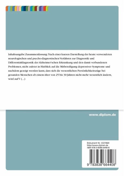 Nach einer kurzen Darstellung der heute verwendeten neurologischen und psycho-diagnostischen Verfahren zur Diagnostik und Differentialdiagnostik der Alzheimer'schen Erkrankung und den damit verbundenen Problemen, nicht zuletzt in Hinblick auf die Mitbeteiligung depressiver Symptome und nachdem gezeigt werden kann, dass sich die wesentlichen Persönlichkeitszüge bei gesunden Menschen ab einem Alter von 25 bis 30 Jahren nicht mehr wesentlich ändern, wird auf Veränderungen der Persönlichkeit bei Morbus Alzheimer eingegangen, die nicht ausschließlich durch physiologische Umstände erklärt werden können und zeigen, dass den persönlichkeitspsychologischen Aspekten neben den relativ gut erforschten gedächtnisspezifischen Problemen in Zukunft eine bedeutende Rolle im Bedingungsgefüge eingeräumt werden sollte. Abschließend werden in diesem Zusammenhang auch psychosomatische Schädigungsmodelle erwähnt.