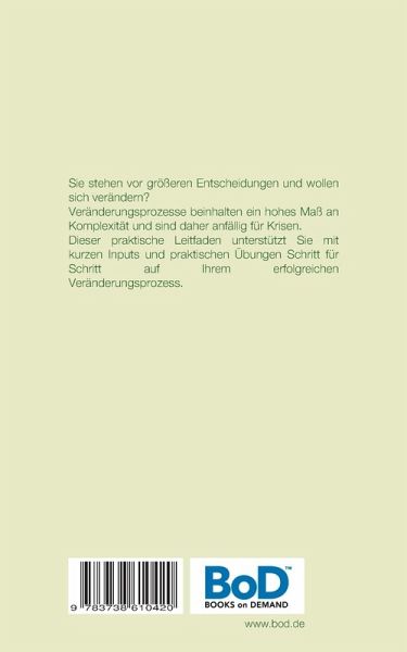 Sie stehen vor größeren Entscheidungen und wollen sich verändern? Veränderungsprozesse beinhalten ein hohes Maß an Komplexität und sind daher anfällig für Krisen.Dieser praktische Leitfaden unterstützt Sie mit kurzen Inputs und praktischen Übungen Schritt für Schritt auf Ihrem erfolgreichen Veränderungsprozess.