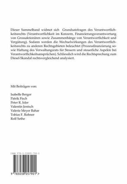 Dieser Sammelband widmet sich Grundsatzfragen des Verantwortlichkeitsrechts (Verantwortlichkeit im Konzern, Finanzierungsverantwortung von Grossaktionären sowie Zusammenhänge von Verantwortlichkeit und Vergütung). Sodann werden die Wechselwirkungen des Verantwortlichkeitsrechts zu anderen Rechtsgebieten beleuchtet (Prozessfinanzierung sowie Haftung des Verwaltungsrats für Steuern und steuerliche Aspekte bei Verantwortlichkeitsansprüchen). Schliesslich wird die Rechtsprechung zum Diesel-Skandal rechtsvergleichend analysiert.