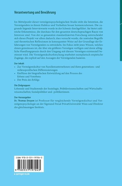 Im Mittelpunkt dieser vermögenspsychologischen Studie steht die Intention, die Vermögenden in ihrem Habitus und Verhalten besser kennenzulernen. Die zugrunde liegende Interviewserie wurde in der Schweiz durchgeführt. Sie bietet zahlreiche Erkenntnisse, die durchaus für den gesamten deutschsprachigen Raum von Interesse sind. Von der so genannten standardisierten Forschung unterscheidet sich dieses Projekt vor allem dadurch, dass versucht wurde, die zentralen Begriffe und theoretischen Reflexionen in konsequenter Weise auf der Grundlage der Erfahrungen von Vermögenden zu entwickeln. Die Vermögenskulturforschung erarbeitet exemplarisch empirische Zugänge, die explizit auf den Aussagen der Vermögenden basieren.