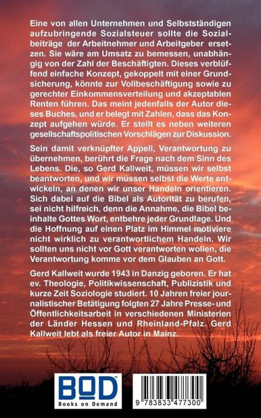 Eine von allen Unternehmen und Selbstständigen aufzubringende Sozialsteuer sollte die Sozialbeiträge der Arbeitnehmer und Arbeitgeber ersetzen. Sie wäre am Umsatz zu bemessen, unabhängig von der Zahl der Beschäftigten. Dieses verblüffend einfache Konzept, gekoppelt mit einer "Grundsicherung durch Gegenleistung", könnte zur Vollbeschäftigung sowie zu gerechter Einkommensverteilung und akzeptablen Renten führen. Das meint jedenfalls der Autor dieses Buches, und er belegt mit Zahlen, dass das Konzept aufgehen würde. Er stellt es neben weiteren gesellschaftspolitischen Vorschlägen zur Diskussion. Sein damit verknüpfter Appell, Verantwortung zu übernehmen, berührt die Frage nach dem Sinn des Lebens. Die, so Gerd Kallweit, müssen wir selbst beantworten, und wir müssen selbst die Werte entwickeln, an denen wir unser Handeln orientieren. Sich dabei auf die Bibel als Autorität zu berufen, sei nicht hilfreich, denn die Annahme, die Bibel beinhalte Gottes Wort, entbehre jeder Grundlage. Unddie Hoffnung auf einen Platz im Himmel motiviere nicht wirklich zu verantwortlichem Handeln.