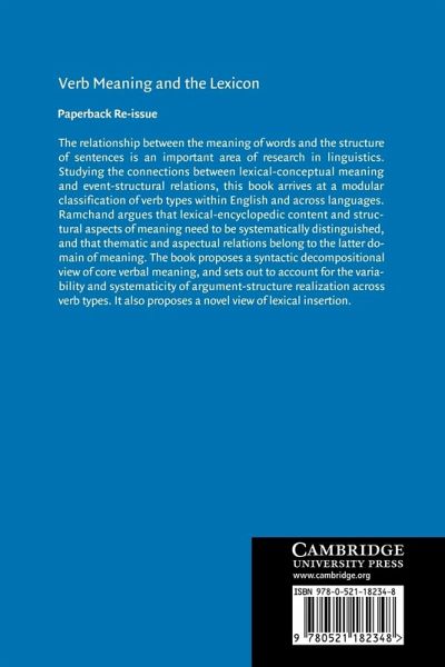 The relationship between the meaning of words and the structure of sentences is an important area of research in linguistics. Studying the connections between lexical conceptual meaning and event structural relations, this book arrives at a modular classification of verb types within English and across languages. Ramchand argues that lexical encyclopedic content and event structural aspects of meaning need to be systematically distinguished, and that thematic and aspectual relations belong to the latter domain of meaning. The book proposes a syntactic decompositional view of core verbal meaning, and sets out to account for the variability and systematicity of argument structure realisation across verb types. It also proposes an interesting view of lexical insertion.