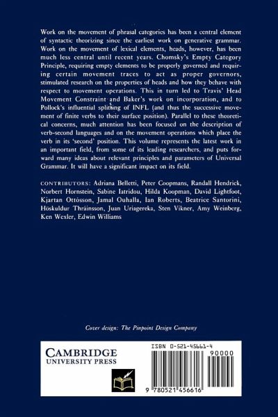 Work on the movement of phrasal categories has been a central element of syntactic theorizing since the earliest work on generative grammar. Work on the movement of lexical elements, heads, however, has been much less central until recent years. Chomsky's Empty Category Principle, requiring empty elements to be properly governed and requiring certain movement traces to act as proper governors, stimulated research on the properties of heads and how they behave with respect to movement operations. This in turn led to Travis' Head Movement Constraint and Baker's work on incorporation, and to Pollock's influential splitting of INFL (and thus the successive movement of finite verbs to their surface position). Parallel to these theoretical concerns, much attention has been focused on the description of verb-second languages and on the movement operations which place the verb in its 'second' position. This volume represents the latest work in an important field, from some of its leading researchers, and puts forward many ideas about relevant principles and parameters of Universal Grammar. It will have a significant impact on its field.