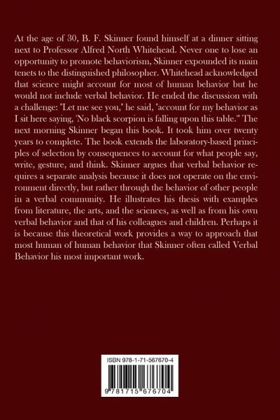 At the age of 30, B. F. Skinner found himself at a dinner sitting next to Professor Alfred North Whitehead. Never one to lose an opportunity to promote behaviorism, Skinner expounded its main tenets to the distinguished philosopher. Whitehead acknowledged that science might account for most of human behavior but he would not include verbal behavior. He ended the discussion with a challenge: "Let me see you," he said, "account for my behavior as I sit here saying, 'No black scorpion is falling upon this table.'" The next morning Skinner began this book. It took him over twenty years to complete. The book extends the laboratory-based principles of selection by consequences to account for what people say, write, gesture, and think. Skinner argues that verbal behavior requires a separate analysis because it does not operate on the environment directly, but rather through the behavior of other people in a verbal community. He illustrates his thesis with examples from literature, the arts, and the sciences, as well as from his own verbal behavior and that of his colleagues and children. Perhaps it is because this theoretical work provides a way to approach that most human of human behavior that Skinner often called Verbal Behavior his most important work.