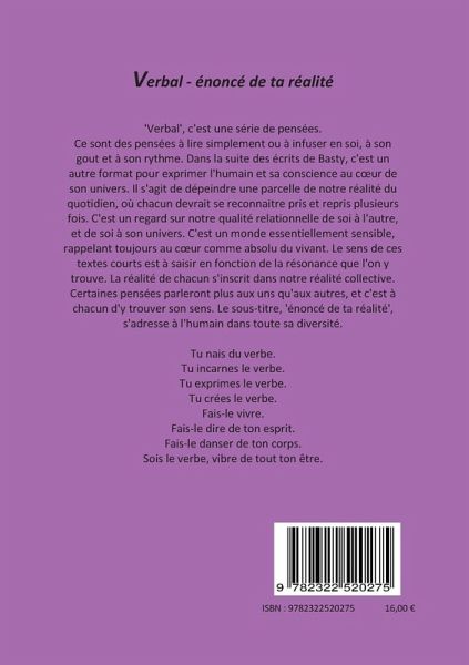 'Verbal', c'est une série de pensées.Ce sont des pensées à lire simplement ou à infuser en soi, à son gout et à son rythme. Dans la suite des écrits de Basty, c'est un autre format pour exprimer l'humain et sa conscience au coeur de son univers. Il s'agit de dépeindre une parcelle de notre réalité du quotidien, où chacun devrait se reconnaitre pris et repris plusieurs fois. C'est un regard sur notre qualité relationnelle de soi à l'autre, et de soi à son univers. C'est un monde essentiellement sensible, rappelant toujours au coeur comme absolu du vivant. Le sens de ces textes courts est à saisir en fonction de la résonance que l'on y trouve. La réalité de chacun s'inscrit dans notre réalité collective. Certaines pensées parleront plus aux uns qu'aux autres, et c'est à chacun d'y trouver son sens. Le sous-titre, 'énoncé de ta réalité', s'adresse à l'humain dans toute sa diversité.