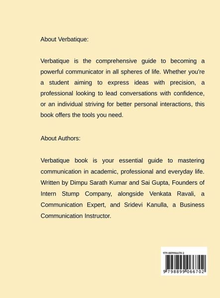 Verbatique is a practical guide to mastering communication across academic, professional, and everyday life. From building clarity in conversations to presenting ideas with confidence, this book equips readers with essential tools to enhance speaking, listening, and interpersonal skills. The Verbatique book is written by Dimpu Sarath Kumar and Sai Gupta, Founders of Intern Stump, alongside Ravali, an HR and Communication Trainer, and Sridevi Kanulla, a Communication and Business Communication Instructor.