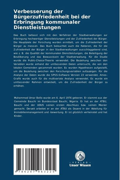 Das Buch befasst sich mit den Verfahren der Stadtverwaltungen zur Erbringung hochwertiger Dienstleistungen und der Zufriedenheit der Bürger. Die Hauptziele der Forschung wurden ermittelt, um die Zufriedenheit der Bürger zu messen. Das Buch beleuchtet auch die Faktoren, die für die Zufriedenheit der Bürger in den Stadtverwaltungen ausschlaggebend sind, wie z. B. die Qualität der kommunalen Dienstleistungen, die Beteiligung der Bevölkerung und das Bewusstsein der Stadtverwaltung. Für die Studie wurde die Public-Choice-Theorie verwendet. Die Beziehung zwischen den Variablen wurde anhand der umfassenden Daten untersucht, die von den lokalen Gemeinden gesammelt wurden. Es wurden Hypothesen aufgestellt, um die Beziehung zwischen den Forschungsvariablen aufzuzeigen. Für die Analyse der Daten wurde die SPSS-Software Version 23 verwendet. Amos-Grafik wurde auch für die multivariate Analyse verwendet. Es wurde ein umfassender Rahmen entwickelt, um die Zufriedenheit der Bürger zu erhöhen.