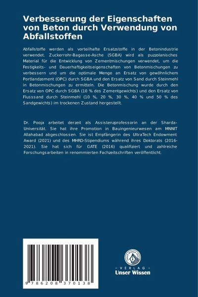 Abfallstoffe werden als vorteilhafte Ersatzstoffe in der Betonindustrie verwendet. Zuckerrohr-Bagasse-Asche (SGBA) wird als puzzolanisches Material für die Entwicklung von Zementmischungen verwendet, um die Festigkeits- und Dauerhaftigkeitseigenschaften von Betonmischungen zu verbessern und um die optimale Menge an Ersatz von gewöhnlichem Portlandzement (OPC) durch SGBA und den Ersatz von Sand durch Steinmehl in Betonmischungen zu ermitteln. Die Betonmischung wurde durch den Ersatz von OPC durch SGBA (10 % des Zementgewichts) und den Ersatz von Flusssand durch Steinmehl (10 %, 20 %, 30 %, 40 % und 50 % des Sandgewichts) im trockenen Zustand hergestellt.