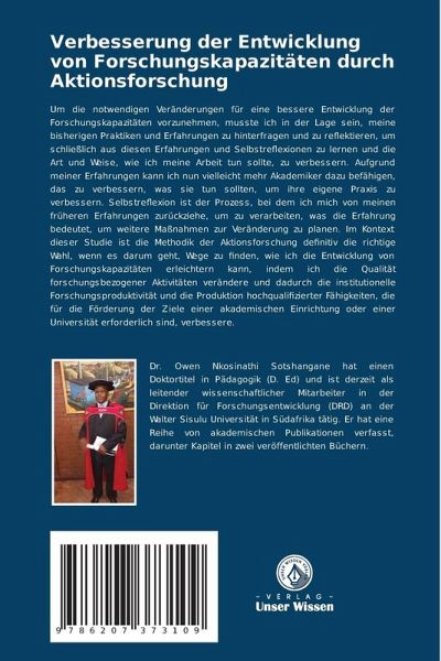 Um die notwendigen Veränderungen für eine bessere Entwicklung der Forschungskapazitäten vorzunehmen, musste ich in der Lage sein, meine bisherigen Praktiken und Erfahrungen zu hinterfragen und zu reflektieren, um schließlich aus diesen Erfahrungen und Selbstreflexionen zu lernen und die Art und Weise, wie ich meine Arbeit tun sollte, zu verbessern. Aufgrund meiner Erfahrungen kann ich nun vielleicht mehr Akademiker dazu befähigen, das zu verbessern, was sie tun sollten, um ihre eigene Praxis zu verbessern. Selbstreflexion ist der Prozess, bei dem ich mich von meinen früheren Erfahrungen zurückziehe, um zu verarbeiten, was die Erfahrung bedeutet, um weitere Maßnahmen zur Veränderung zu planen. Im Kontext dieser Studie ist die Methodik der Aktionsforschung definitiv die richtige Wahl, wenn es darum geht, Wege zu finden, wie ich die Entwicklung von Forschungskapazitäten erleichtern kann, indem ich die Qualität forschungsbezogener Aktivitäten verändere und dadurch die institutionelleForschungsproduktivität und die Produktion hochqualifizierter Fähigkeiten, die für die Förderung der Ziele einer akademischen Einrichtung oder einer Universität erforderlich sind, verbessere.