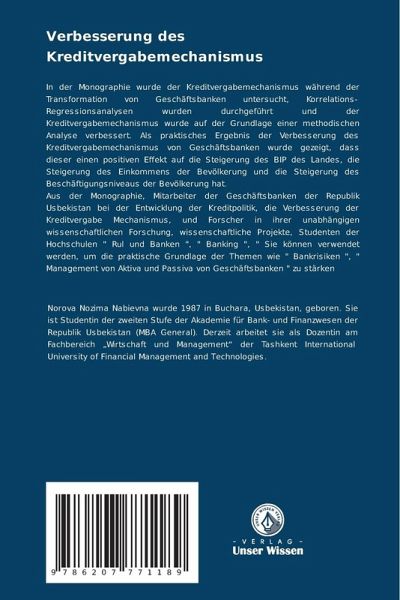 In der Monographie wurde der Kreditvergabemechanismus während der Transformation von Geschäftsbanken untersucht, Korrelations-Regressionsanalysen wurden durchgeführt und der Kreditvergabemechanismus wurde auf der Grundlage einer methodischen Analyse verbessert. Als praktisches Ergebnis der Verbesserung des Kreditvergabemechanismus von Geschäftsbanken wurde gezeigt, dass dieser einen positiven Effekt auf die Steigerung des BIP des Landes, die Steigerung des Einkommens der Bevölkerung und die Steigerung des Beschäftigungsniveaus der Bevölkerung hat.Aus der Monographie, Mitarbeiter der Geschäftsbanken der Republik Usbekistan bei der Entwicklung der Kreditpolitik, die Verbesserung der Kreditvergabe Mechanismus, und Forscher in ihrer unabhängigen wissenschaftlichen Forschung, wissenschaftliche Projekte, Studenten der Hochschulen " Rul und Banken ", " Banking ", " Sie können verwendet werden, um die praktische Grundlage der Themen wie " Bankrisiken ", " Management von Aktiva und Passiva von Geschäftsbanken " zu stärken