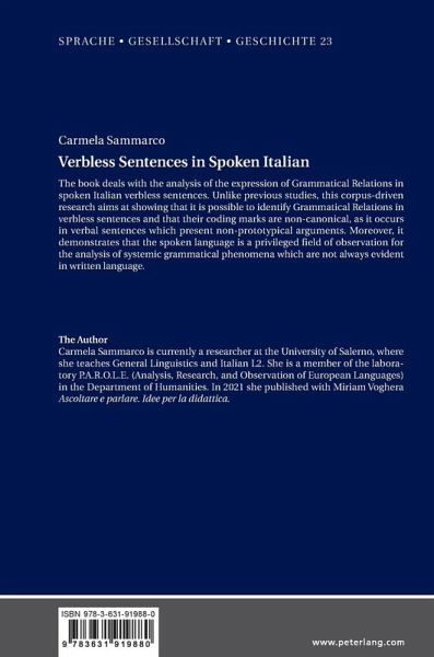 The book deals with the analysis of the expression of Grammatical Relations in spoken Italian verbless sentences. Unlike previous studies, this corpus-driven research aims at showing that it is possible to identify Grammatical-Relations in verbless sentences and that their encoding marks are non-canonical, as it occurs in verbal sentences which present non-prototypical arguments. Moreover, it demonstrates that the spoken language is a privileged field of observation for the analysis of systemic grammatical phenomena which are not always evident in written language.