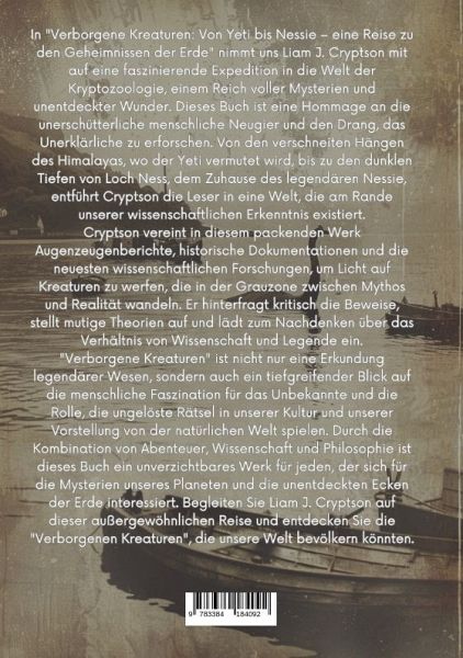 In "Verborgene Kreaturen: Von Yeti bis Nessie - eine Reise zu den Geheimnissen der Erde" nimmt uns Liam J. Cryptson mit auf eine faszinierende Expedition in die Welt der Kryptozoologie, einem Reich voller Mysterien und unentdeckter Wunder. Dieses Buch ist eine Hommage an die unerschütterliche menschliche Neugier und den Drang, das Unerklärliche zu erforschen. Von den verschneiten Hängen des Himalayas, wo der Yeti vermutet wird, bis zu den dunklen Tiefen von Loch Ness, dem Zuhause des legendären Nessie, entführt Cryptson die Leser in eine Welt, die am Rande unserer wissenschaftlichen Erkenntnis existiert.Cryptson vereint in diesem packenden Werk Augenzeugenberichte, historische Dokumentationen und die neuesten wissenschaftlichen Forschungen, um Licht auf Kreaturen zu werfen, die in der Grauzone zwischen Mythos und Realität wandeln. Er hinterfragt kritisch die Beweise, stellt mutige Theorien auf und lädt zum Nachdenken über das Verhältnis von Wissenschaft und Legende ein."Verborgene Kreaturen" ist nicht nur eine Erkundung legendärer Wesen, sondern auch ein tiefgreifender Blick auf die menschliche Faszination für das Unbekannte und die Rolle, die ungelöste Rätsel in unserer Kultur und unserer Vorstellung von der natürlichen Welt spielen. Durch die Kombination von Abenteuer, Wissenschaft und Philosophie ist dieses Buch ein unverzichtbares Werk für jeden, der sich für die Mysterien unseres Planeten und die unentdeckten Ecken der Erde interessiert. Begleiten Sie Liam J. Cryptson auf dieser außergewöhnlichen Reise und entdecken Sie die "Verborgenen Kreaturen", die unsere Welt bevölkern könnten.