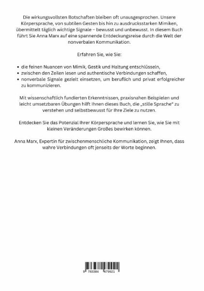 Die wirkungsvollsten Botschaften bleiben oft unausgesprochen. Unsere Körpersprache, von subtilen Gesten bis hin zu ausdrucksstarken Mimiken, übermittelt täglich wichtige Signale - bewusst und unbewusst. In diesem Buch führt Sie Anna Marx auf eine spannende Entdeckungsreise durch die Welt der nonverbalen Kommunikation.Erfahren Sie, wie Sie:die feinen Nuancen von Mimik, Gestik und Haltung entschlüsseln,zwischen den Zeilen lesen und authentische Verbindungen schaffen,nonverbale Signale gezielt einsetzen, um beruflich und privat erfolgreicher zu kommunizieren.Mit wissenschaftlich fundierten Erkenntnissen, praxisnahen Beispielen und leicht umsetzbaren Übungen hilft Ihnen dieses Buch, die "stille Sprache" zu verstehen und selbst-bewusst für Ihre Ziele zu nutzen.Entdecken Sie das Potenzial Ihrer Körpersprache und lernen Sie, wie Sie mit kleinen Veränderungen Großes bewirken können.Anna Marx, Expertin für zwischenmenschliche Kommunikation, zeigt Ihnen, dass wahre Verbindungen oft jenseits der Worte beginnen.
