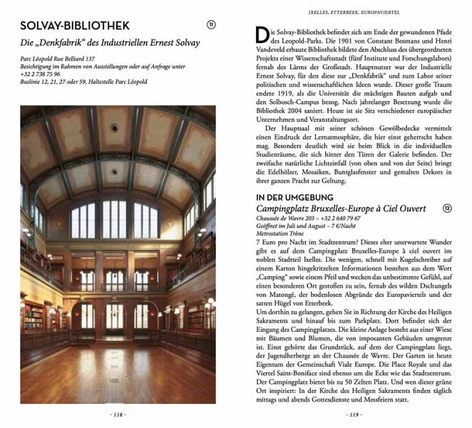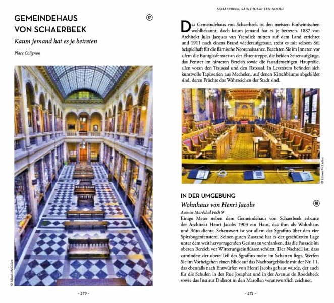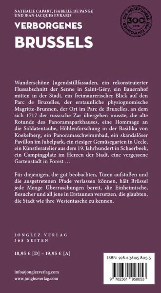 Verbogenes Brüssel Wunderschöne Jugendstillfassaden, ein rekonstruierter Flussabschnitt der Senne in Saint-Géry, ein Bauernhof mitten in der Stadt, ein freimaurerischer Blick auf den Parc de Bruxelles, der erstaunliche physiognomische Magritte-Brunnen, der Ort im Parc de Bruxelles, an dem sich 1717 der russische Zar übergeben musste, die alte Rotunde des Panoramaparkhauses, eine Hommage an die Soldatentaube, Höhlenforschung in der Basilika von Koekelberg, ein Panoramaschwimmbad, ein skandalöser Pavillon im Jubelpark, ein riesiger Gemüsegarten in Uccle, ein Künstleratelier aus dem 19. Jahrhundert in Schaerbeek, ein Campingplatz im Herzen der Stadt, eine vergessene Gartenstadt in Forest .... Für diejenigen, die gut beobachten, Türen aufstoßen und die ausgetretenen Pfade verlassen können, hält Brüssel jede Menge Überraschungen bereit, die Einheimische, Besucher und all jene in Erstaunen versetzen, die glaubten, die Stadt wie ihre Westentasche zu kennen.