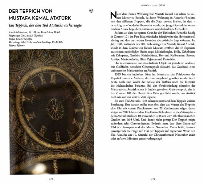 Das zum Pilgerort gewordene Grab eines Pferdes, ein Teppich, der den Tod von Mustafa Kemal Atatürk vorhersagte, Teile des Schwarzen Steins aus Mekka , der voreilig gebügelte Mantel des Propheten Mohammed, ein Häufchen heißer Asche, die das Osmanische Reich rettete, eines von zwölf Gräbern eines Heiligen in einem Leuchtturm, die Skulptur eines Kohlkopfs zur Erinnerung an die sportlichen Wettkämpfe im Topkapi-Palast, die Spuren des Waffenhändlers Basil Zaharoff in Tim und Struppi - Der Arumbaya-Fetisch, ein großartiges Café in einer Synagoge , oftmals übersehene Jugendstilgebäude, eine Moschee zum Schutz vor Erdbeben, der angebliche Standort von Draculas Kopf, Wikinger-Graffitis in der Hagia Sophia ...
