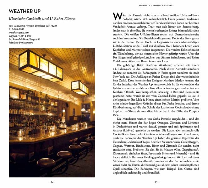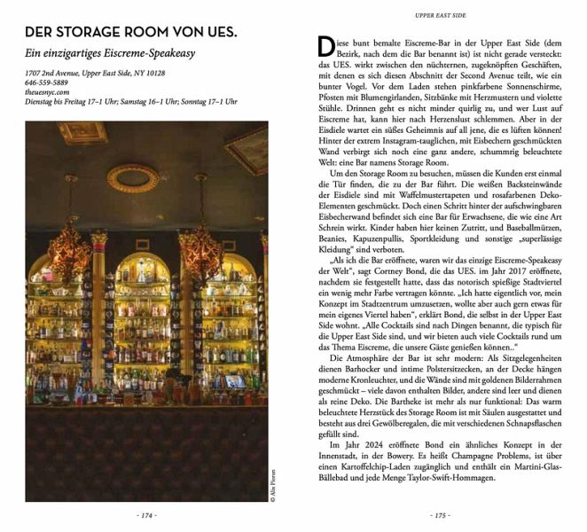 Einhundert Bars und Restaurants mit außergewöhnlicher Ausstattung, exzentrischen Inhabern, fantastischem Essen , Relikten aus alten Zeiten und mehr ... diese Locations werden nicht nur Underground-Fans, Liebhaber von postindustriellem Design, Gourmets, Cocktailfans und Anhänger von World Food begeistern, sondern auch all jene erfreuen (und überraschen!), die neugierig darauf sind, die unendlichen Möglichkeiten zu entdecken, wie man sich in New York vergnügen kann.