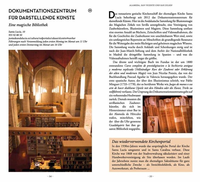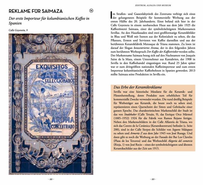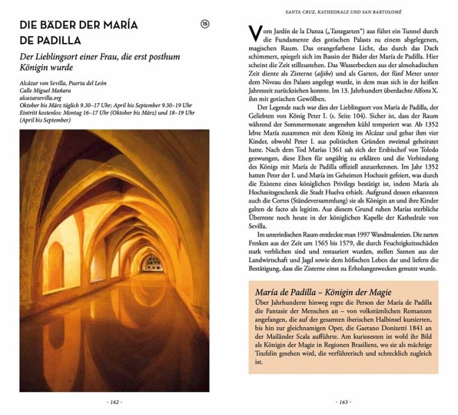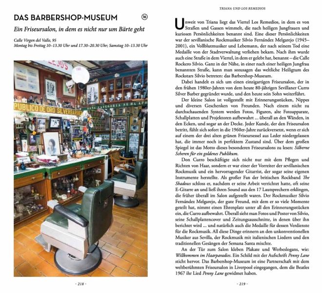 Das Profil von Grace Kelly auf der Rathausfassade, das Grab des Sohnes von Christoph Kolumbus, ein mittelalterlicher jüdischer Friedhof auf einem Parkplatz, ein Friseursalon der besonderen Art, vergessene Erinnerungen an die Zeit der Dampfschifffahrt auf dem Guadalquivir, Freimaurersymbole in einer Kirche, Überreste des andalusischen Pavillons der Weltausstellung von 1929, ein verkanntes modernistisches Elektrizitätswerk, ein Exemplar der Nazi-Chiffriermaschine Enigma, eine ungewöhnliche Sammlung chinesischer und japanischer Kunst in einem Palast im Renaissance Stil, die Säulen einer mittelalterlichen Synagoge ...