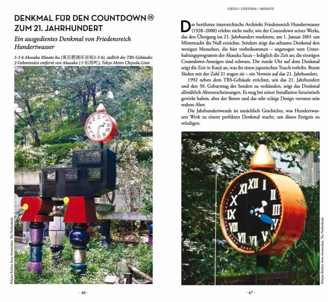 Ein Park, der nur per Aufzug zu erreichen ist, ein Canyon mitten in der Stadt, eine Statue gegen Warzen, öffentliche Designer-Toiletten , ein Park für weltweit einzigartige Sportarten, ein außergewöhnlicher Baum, der einem hilft, mit dem Rauchen aufzuhören, eine elektronische Sonnenblume, ein imposanter moderner Tempel im Herzen von Shinjuku, eine Straße, die Tokioter Taxifahrern Albträume beschert, ein riesiges Gebäude in Form eines Kriegsschiffs, verborgene Wasserläufe, ein Park für Philosophen , ein Park für neue Sportarten, ein Stadion, in das Krabben einliefen, ein geheimer Ort, um die Kirschblüte zu bewundern , ein Gebäude wie ein Science-Fiction-Kampfroboter, Stelen zum Gedenken an jene, die ihre Körper für die Wissenschaft sezieren ließen, ein Bauernhof in einem Bürohaus, die exzentrische Architektur des Gaudí von Tokio ...