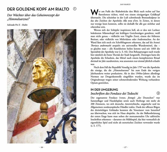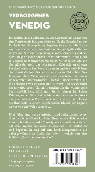 VERBORGENES VENEDIG Entdecken Sie die Geheimnisse des Markusdoms weitab von den Touristenpfaden, entschlüsseln Sie die Botschaften der Kapitelle des Dogenpalastes , begeben Sie sich auf die Suche nach der alchemistischen Skulptur des geflügelten Pferdes und fahren Sie durch den einzigen unterirdischen Kanal der Stadt, folgen Sie den Spuren des Wundermittels Theriak , das in Venedig über lange Zeit zubereitet wurde, lernen Sie, die Gemälde der nach der hebräischen Kabbalah errichteten Scuola Grande di San Rocco zu deuten und den nach Plänen der musikalischen Kabbalah errichteten Sakralbau San Francesco della Vigna zu verstehen, besichtigen Sie einen unbekannten unterirdischen Friedhof, überschreiten Sie die Schwellen von Palästen und Klöstern und lustwandeln Sie in verborgenen Gärten, besuchen Sie die wundervolle Seminarbibliothek, nächtigen Sie in einem herrlichen Palazzo, kaufen Sie auf dem Markt des Frauengefängnisses ein, spielen Sie eine Partie Boccia mitten in der Stad t, lassen Sie Ihre Seele in einem wundervollen Kloster der Lagune weitab von der Welt baumeln ... Fünf Jahre lang wurde geforscht und recherchiert, bevor dieser außergewöhnliche Reiseführer verwirklicht werden konnte, bei dem sowohl Venedigfans als auch Venezianer auf ihre Kosten kommen. Lassen Sie sich entführen und begeben Sie sich auf eine Entdeckungsreise in die außergewöhnlichste Stadt der Welt weitab von den üblichen "Touristenrennstrecken". VERBORGENES - Die etwas anderen Reiseführer * Preisgekrönte Reiseführer , verfasst von lokalen Expert:innen - entdecken Sie unbekannte, faszinierende Orte, die selbst Einheimische überraschen - von Einwohnern für Einwohner * Geheimtipps, (jahrelang erforschte) einzigartige Orte , die in keinem herkömmlichen Reiseführer zu finden und der breiten Öffentlichkeit unbekannt sind * Spannende Entdeckungstouren abseits der Touristenmassen * Voller faszinierender Fakten , liebevoller Details und inspirierender Erzählungen * Ein Muss für Einheimische und neugierige Reisende , die das Kulturgut einer Stadt in all ihren Facetten kennenlernen möchten