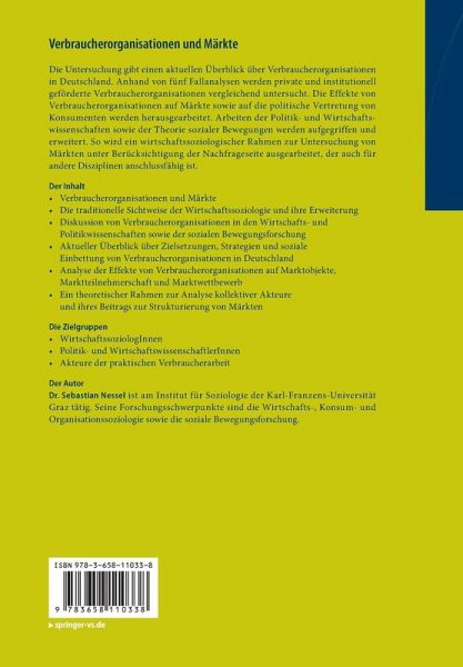 Die Untersuchung gibt einen aktuellen Überblick über Verbraucherorganisationen in Deutschland. Anhand von fünf Fallanalysen werden private und institutionell geförderte Verbraucherorganisationen vergleichend untersucht. Die Effekte von Verbraucherorganisationen auf Märkte sowie auf die politische Vertretung von Konsumenten werden herausgearbeitet. Arbeiten der Politik- und Wirtschaftswissenschaften sowie der Theorie sozialer Bewegungen werden aufgegriffen und erweitert. So wird ein wirtschaftssoziologischer Rahmen zur Untersuchung von Märkten unter Berücksichtigung der Nachfrageseite ausgearbeitet, der auch für andere Disziplinen anschlussfähig ist.