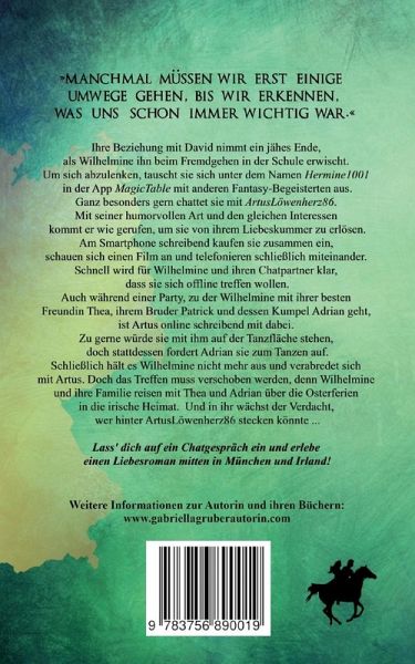 Verch@ttet - Verliebt in Irland»Manchmal müssen wir erst einige Umwege gehen, bis wir erkennen, was uns schon immer wichtig war.«Ihre Beziehung mit David nimmt ein jähes Ende, als Wilhelmine ihn beim Fremdgehen in der Schule erwischt. Um sich abzulenken, tauscht sie sich unter dem Namen Hermine1001 in der App MagicTable mit anderen Fantasy-Begeisterten aus. Ganz besonders gern chattet sie mit ArtusLöwenherz86. Mit seiner humorvollen Art und den gleichen Interessen kommt er wie gerufen, um sie von ihrem Liebeskummer zu erlösen.Am Smartphone schreibend kaufen sie zusammen ein, schauen sich einen Film an und telefonieren schließlich miteinander. Schnell wird für Wilhelmine und ihren Chatpartner klar, dass sie sich offline treffen wollen.Auch während einer Party, zu der Wilhelmine mit ihrer besten Freundin Thea, ihrem Bruder Patrick und dessen Kumpel Adrian geht, ist Artus online schreibend mit dabei. Zu gerne würde sie mit ihm auf der Tanzfläche stehen, doch stattdessen fordert Adrian sie zum Tanzen auf.Schließlich hält es Wilhelmine nicht mehr aus und verabredet sich mit Artus. Doch das Treffen muss verschoben werden, denn Wilhelmine und ihre Familie reisen mit Thea und Adrian über die Osterferien in die irische Heimat.Und in ihr wächst der Verdacht, wer hinter ArtusLöwenherz86 stecken könnte ...