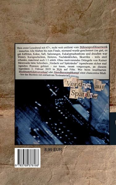 Mein erster Leseabend mit 47+, recht weit entfernt vom Bühnenprofifeuerwerk - immerhin: Alle blieben bis zum Finale, niemand wurde geschmiert (na gut, es gab Käffchen, Kekse, Saft, Salzstangen, Eukalyptusbonbons und draußen war Nordseewinter). Kurzgeschichten, Heiteres, Nachdenkliches, Skurriles - teils steil erfunden, manchmal auch 1:1 erlebt.