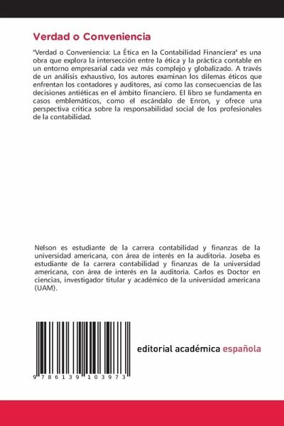 "Verdad o Conveniencia: La Ética en la Contabilidad Financiera" es una obra que explora la intersección entre la ética y la práctica contable en un entorno empresarial cada vez más complejo y globalizado. A través de un análisis exhaustivo, los autores examinan los dilemas éticos que enfrentan los contadores y auditores, así como las consecuencias de las decisiones antiéticas en el ámbito financiero. El libro se fundamenta en casos emblemáticos, como el escándalo de Enron, y ofrece una perspectiva crítica sobre la responsabilidad social de los profesionales de la contabilidad.
