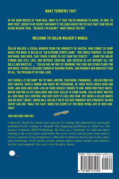 What terrifies you? In the dark recess of your soul, what is it that you've managed to avoid, to hide, to bury deep, never to be faced? And what if the Lord asked you to face that fear for no other reason than, "Because I'm asking?" What would you do? Welcome to Collin Walker's world. Collin Walker, a social worker from the innercity of Oakton, Ohio comes to Camp Grace for what is billed as "an extreme sports camp." Her single purpose: to show her ward, Rob Sider, that there is more to life than the streets "...show you can be strong and still love, win without cheating, and succeed in life without all the bells and whistles..." Collin has no way of knowing that God has other plans for her week: facing a lifelong terror of rushing rivers, and perhaps her greatest fear of all, the possibility of real love. Jeff Farrell is the camp "go-to"man: janitor, tour guide, paramedic... Collin finds his easy banter, gentle humor and quick wit intriguing. As their paths cross over and over-and over and over-Collin finds herself drawn to him. When Rob picks whitewater rafting as his challenge and asks Collin to come along, Collin must muster all her rigid self-control and her faith to face her fear. But when a killer makes her his next target, which will she rely on to see her through? Her strength? Or her faith? Can she "walk the talk" when the events of the week spiral out of her control? Join her and find out.