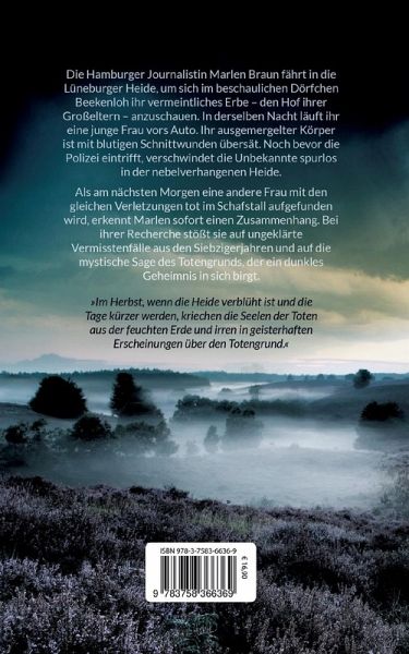 Die Hamburger Journalistin Marlen Braun fährt in die Lüneburger Heide, um sich im beschaulichen Dörfchen Beekenloh ihr vermeintliches Erbe - den Hof ihrer Großeltern - anzuschauen. In derselben Nacht läuft ihr eine junge Frau vors Auto. Ihr ausgemergelter Körper ist mit blutigen Schnittwunden übersät. Noch bevor die Polizei eintrifft, verschwindet die Unbekannte spurlos in der nebelverhangenen Heide.Als am nächsten Morgen eine andere Frau mit den gleichen Verletzungen tot im Schafstall aufgefunden wird, erkennt Marlen sofort einen Zusammenhang. Bei ihrer Recherche stößt sie auf ungeklärte Vermisstenfälle aus den Siebzigerjahren und auf die mystische Sage des Totengrunds, der ein dunkles Geheimnis in sich birgt.Marlen gerät in einen rätselhaften Strudel aus Vergangenheit und Gegenwart. Sie muss sich ihrer eigenen Familiengeschichte stellen, um den wahren Täter zu finden. Nichts ahnend, dass dieser sie längst im Visier hat.»Im Herbst, wenn die Heide verblüht ist und die Tage kürzerwerden, kriechen die Seelen der Toten aus der feuchten Erde und irren in geisterhaften Erscheinungen über den Totengrund.«