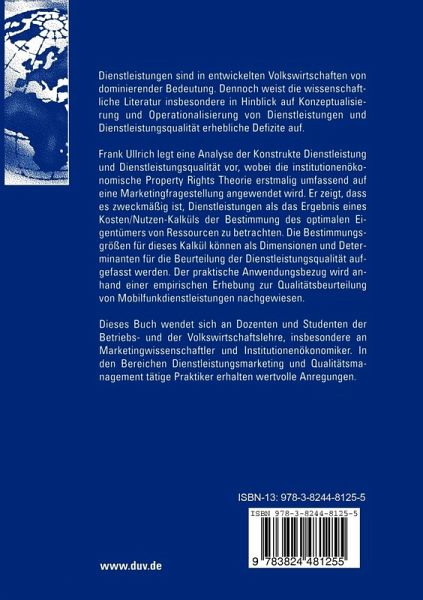 Frank Ullrich legt eine Analyse der Konstrukte Dienstleistung und Dienstleistungsqualität vor, wobei die institutionenökonomische Property Rights Theorie erstmalig umfassend auf eine Marketingfragestellung angewendet wird. Er zeigt, dass es zweckmäßig ist, Dienstleistungen als das Ergebnis eines Kosten/Nutzen-Kalküls der Bestimmung des optimalen Eigentümers von Ressourcen zu betrachten. Die Bestimmungsgrößen für dieses Kalkül können als Dimensionen und Determinanten für die Beurteilung der Dienstleistungsqualität aufgefasst werden. Der praktische Anwendungsbezug wird anhand einer empirischen Erhebung zur Qualitätsbeurteilung von Mobilfunkdienstleistungen nachgewiesen.