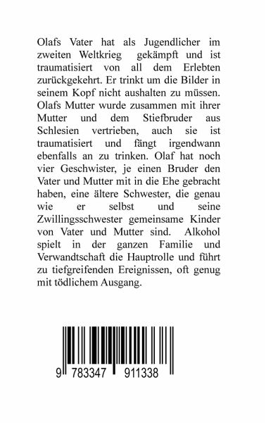 Olaf wird in eine Familie hineingeboren, in der Alkohol die Hauptrolle spielt. Eltern, Geschwister, Verwandte - überall Alkoholprobleme. Alles wiederholt sich in der Familien- und Verwandtschaftsstruktur: uneheliche Kinder, Alkoholsucht, Ehescheidungen, SuizideErst wenn sich jemand mit fachlicher Hilfe genau diese Probleme anschaut und aufarbeitet, anstatt sie zu verdrängen und zu negieren, dann gibt es Veränderungen. Olaf erfährt, dass seine Depression, Versagensangst und sein Kontrollzwang mit den traumatischen Erlebnissen seiner Eltern zusammenhängen und in die nächsten Generationen vererbt worden sind.