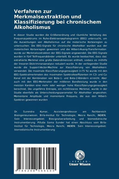 In dieser Studie wurden die Größenordnung und räumliche Verteilung des Frequenzspektrums im Ruhe-Elektroenzephalogramm (EEG) untersucht, um die Auswirkungen von Alkoholismus auf die motorische Kortexregion zu untersuchen. Die EEG-Signale für chronische Alkoholiker wurden aus der motorischen Kortexregion gewonnen und die Hilbert-Huang-Transformation wurde zur Merkmalsextraktion der EEG-Signale angewendet. Die EEG-Signale wurden in fünf Teilfrequenzbänder unterteilt. Es wurde beobachtet, dass das extrahierte Merkmal eine große Datendimension enthielt, sodass es mithilfe der linearen Diskriminanzanalyse reduziert wurde. In der vorliegenden Studie wurde die Support-Vector-Machine zur Klassifizierung von Alkoholikern verwendet. Die maximale Klassifizierungsgenauigkeit (>75 %) wurde mit den EEG-Spektralmerkmalen des maximalen Spektralkoeffizienten im C3- und Cz-Kanal mit der Kombination von Beta-1- und Beta-2-Bändern erreicht. Aber auch mit den EEG-Merkmalen der mittleren Bandleistung wurde in den meisten Kanälen eine mehr oder weniger hohe Klassifizierungsgenauigkeit berechnet. Die ungefähre Entropie, ein nichtlineares Merkmal, wurde in der Studie ebenfalls als Unterscheidungsparameter für Alkoholiker angesehen. Momentane Amplitude und momentane Frequenz, die aus den Hilbert-Spektren gewonnen wurden