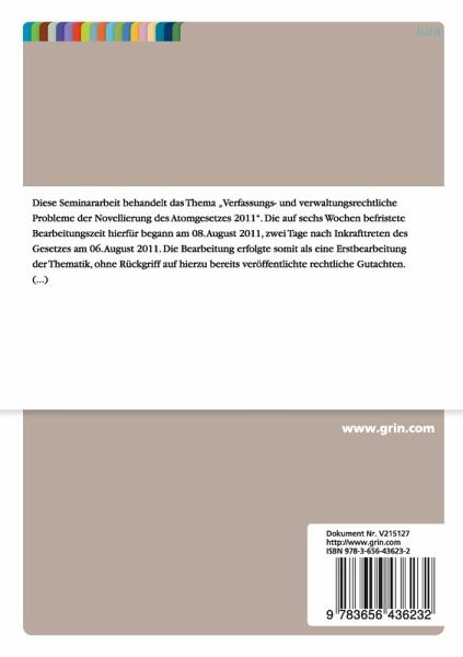 Studienarbeit aus dem Jahr 2011 im Fachbereich Jura - Öffentliches Recht / Staatsrecht / Grundrechte, Note: 12, Bayerische Julius-Maximilians-Universität Würzburg, Sprache: Deutsch, Abstract: Diese Seminararbeit behandelt das Thema "Verfassungs- und verwaltungsrechtliche Probleme der Novellierung des Atomgesetzes 2011". Die auf sechs Wochen befristete Bearbeitungszeit hierfür begann am 08. August 2011, zwei Tage nach Inkrafttreten des Gesetzes am 06. August 2011. Die Bearbeitung erfolgte somit als eine Erstbearbeitung der Thematik, ohne Rückgriff auf hierzu bereits veröffentlichte rechtliche Gutachten. Es bietet sich hierbei an, den Schwerpunkt der Betrachtungen auf einen möglichen Verstoß gegen das Verfassungsrecht zu legen. Der Aufbau gleicht daher einem rechtliches Gutachten, anhand dessen die Vereinbarkeit der dreizehnten Atomgesetznovelle mit dem Verfassungsrecht geprüft wird.
