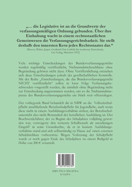 Dokumentation (Originaldokumente im DIN A4-Format) der Verfassungsbeschwerde 1 BvR 3157/15 gegen die in NRW über den Beginn der Volljährigkeit hinaus geltende Schulpflicht (Schulzwang), ohne dass ein Ausbildungsverhältnis besteht. Im vorliegenden Fall hätte der betroffene junge Mensch nach seinem 18. Geburtstag noch fast ein Jahr lang eine Schule besuchen müssen, obwohl kein Ausbildungsverhätnis bestand und er sich selbstständig zu Hause auf einen externen Schulabschluss vorbereitete. Der Betroffene verweigerte den Schulbesuch als ungerechtfertigten Eingriff in seine Grundrechte und wurde deshalb gerichtlich mit einem Bußgeld von 200 Euro belegt, womit auch die entstandenen Gerichts-und Anwaltkosten vom Betroffenen zu zahlen waren.Die Beschwerde wurde - ohne Begründung - nicht zur Entscheidung angenommen. Die Reihe, zu der auch dieser Band gehört, will eine Möglichkeit eröffnen, sich ein Bild auch von denjenigen Verfassungsbeschwerden zu machen, die das BVerfG unbegründet nicht zur Entscheidung annimmt und daher nicht veröffentlicht.