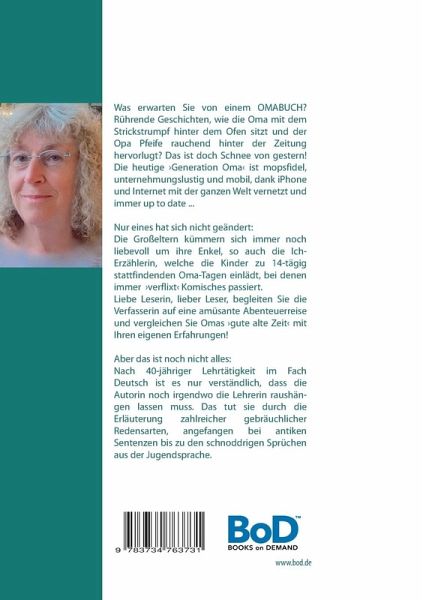 Was erwarten Sie von einem Omabuch? Rührende Geschichten, wie die Oma mit dem Strickstrumpf hinter dem Ofen sitzt und der Opa Pfeife rauchend hinter der Zeitung hervorlugt? Das ist doch Schnee von gestern! Die heutige "Generation Oma" ist mopsfidel, unternehmungslustig und mobil, dank iPhone und Internet mit der ganzen Welt vernetzt und immer up to date ...Nur eines hat sich nicht geändert: Die Großeltern kümmern sich immer noch liebevoll um ihre Enkel; so auch die Ich-Erzählerin, welche zu 14-tägig stattfindenden Oma-Tagen einlädt, bei denen immer "verflixt" Komisches passiert.Liebe Leserin, lieber Leser, begleiten Sie die Verfasserin auf eine amüsante Abenteuerreise und vergleichen Sie Omas »gute alte Zeit« mit Ihren eigenen Erfahrungen! Aber das ist noch nicht alles: Nach 40-jähriger Lehrtätigkeit im Fach Deutsch ist es nur verständlich, dass die Autorin noch irgendwo die Lehrerin raushängen lassen muss. Das tut sie durch die Erläuterung zahlreicher gebräuchlicher Redensarten,angefangen bei antiken Sentenzen bis zu den schnoddrigen Sprüchen aus der Jugendsprache.