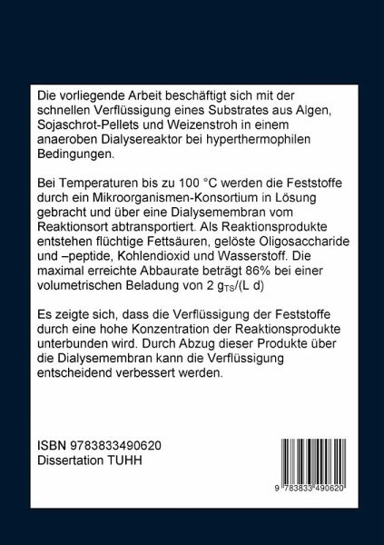 Die vorliegende Arbeit beschäftigt sich mit der schnellen Verflüssigung eines Substrates aus Algen, Sojaschrot-Pellets und Weizenstroh in einem anaeroben Dialysereaktor bei hyperthermophilen Bedingungen.Bei Temperaturen bis zu 100 °C werden die Feststoffe durch ein Mikroorganismen-Konsortium in Lösung gebracht und über eine Dialysemembran vom Reaktionsort abtransportiert. Als Reaktionsprodukte entstehen flüchtige Fettsäuren, gelöste Oligosaccharide und -peptide, Kohlendioxid und Wasserstoff. Die maximal erreichte Abbaurate beträgt 86% bei einer volumetrischen Beladung von 2 gTS/(L d)Es zeigte sich, dass die Verflüssigung der Feststoffe durch eine hohe Konzentration der Reaktionsprodukte unterbunden wird. Durch Abzug dieser Produkte über die Dialysemembran kann die Verflüssigung entscheidend verbessert werden.