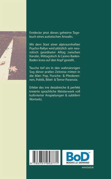Entdecke jetzt dieses geheime Tagebuch eines autistischen Anwalts.Mit dem Start einer alptraumhaften Psycho-Rallye wird plötzlich sein neurotisch geordneter Alltag zwischen Kanzlei, Mittagstisch & Casino Baden-Baden krass auf den Kopf gestellt. Tauche tief ein in den wahnsinnigen Sog dieser prallen Zeitreise mitten in die 80er Jahre: zwischen Elektro-Synthie & Disco-Pop, Porsche- & Pferderennen, Politik, Bibel- & Terror-Paranoia.Erlebe das irre detailreiche & perfekt kreierte sprachliche Meisterwerk voll kultivierter Anspielungen & subtilem Wortwitz.