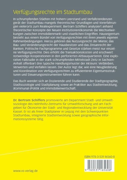 In schrumpfenden Städten mit hohem Leerstand und Verfallstendenzen gerät der Stadtumbau mangels theoretischer Grundlagen und Vorerfahrungen vielerorts zum Realexperiment. Bertram Schiffers analysiert anhand theoretischer Konzepte der Neuen Institutionenökonomik die Wechselwirkungen zwischen Immobilienmarkt und staatlichen Eingriffen. Hauseigentum besteht aus einem Bündel von Verfügungsrechten mit ihren jeweils eigenen Rahmenbedingungen. Hierzu gehören das Nutzungsrecht der Mieter, das Bau- und Veränderungsrecht der Hausbesitzer und das Zinsanrecht der Banken. Politische Fachprogramme und Gesetze stärken meist nur einzelne Verfügungsrechte. Dies erhöht die Transaktionskosten und erschwert notwendige Kooperationen in den perforierten Altbauquartieren. Eine explorative Fallstudie in der stark schrumpfenden Mittelstadt Zeitz in Sachsen-Anhalt offenbart drei typische Handlungsmuster der Akteure: Verbleiben, Verwerten und Verfallen lassen. Der Autor legt dar, wie eine Neugliederung undKoordination von Verfügungsrechten zu effizienteren Eigentumsstrukturen und Steuerungsinstrumenten führen kann.