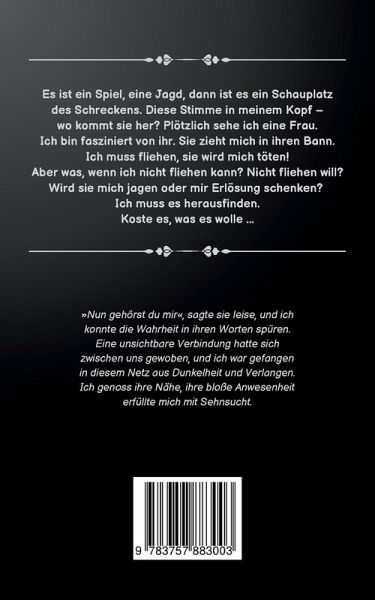 Es ist ein Spiel, eine Jagd, dann ist es ein Schauplatzdes Schreckens. Diese Stimme in meinem Kopf -wo kommt sie her? Plötzlich sehe ich eine Frau.Ich bin fasziniert von ihr. Sie zieht mich in ihren Bann.Ich muss fliehen, sie wird mich töten!Aber was, wenn ich nicht fliehen kann? Nicht fliehen will?Wird sie mich jagen oder mir Erlösung schenken?Ich muss es herausfinden.Koste es, was es wolle ...
