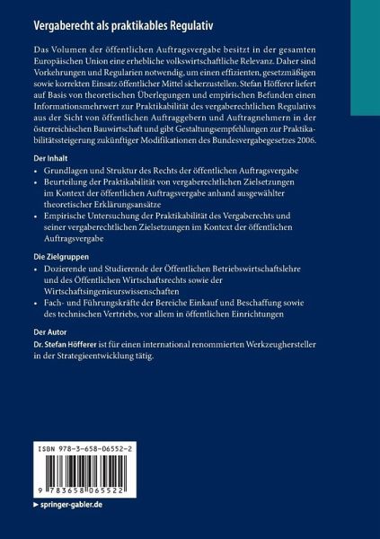 Das Volumen der öffentlichen Auftragsvergabe besitzt in der gesamten Europäischen Union eine erhebliche volkswirtschaftliche Relevanz. Daher sind Vorkehrungen und Regularien notwendig, um einen effizienten, gesetzmäßigen sowie korrekten Einsatz öffentlicher Mittel sicherzustellen. Stefan Höfferer liefert auf Basis von theoretischen Überlegungen und empirischen Befunden einen Informationsmehrwert zur Praktikabilität des vergaberechtlichen Regulativs aus der Sicht von öffentlichen Auftraggebern und Auftragnehmern in der österreichischen Bauwirtschaft und gibt Gestaltungsempfehlungen zur Praktikabilitätssteigerung zukünftiger Modifikationen des Bundesvergabegesetzes 2006.