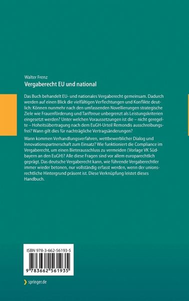 "... Insgesamt gibt Frenz einen breiten und lehrreichen Einblick in die schwierige Materie des Vergaberechts. Wichtige Urteile des Europäischen Gerichtshofs werden stets entsprechend ihrer Bedeutung berücksichtigt und hervorgehoben. ... das Handbuch breite Aufnahme bei Behörden, Unternehmen und Gerichten findet." (Dr. Christoph Klages, in: AbfallR, Heft 1, 2019)
