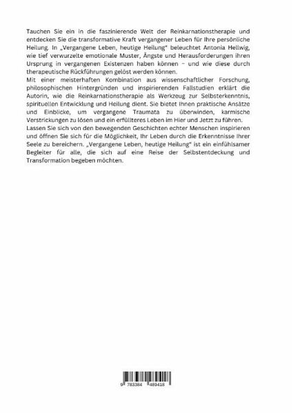 Tauchen Sie ein in die faszinierende Welt der Reinkarnationstherapie und entdecken Sie die transformative Kraft vergangener Leben für Ihre persönliche Heilung. In "Vergangene Leben, heutige Heilung" beleuchtet Antonia Hellwig, wie tief verwurzelte emotionale Muster, Ängste und Herausforderungen ihren Ursprung in vergangenen Existenzen haben können - und wie diese durch therapeutische Rückführungen gelöst werden können.Mit einer meisterhaften Kombination aus wissenschaftlicher Forschung, philosophischen Hintergründen und inspirierenden Fallstudien erklärt die Autorin, wie die Reinkarnationstherapie als Werkzeug zur Selbsterkenntnis, spirituellen Entwicklung und Heilung dient. Sie bietet Ihnen praktische Ansätze und Einblicke, um vergangene Traumata zu überwinden, karmische Verstrickungen zu lösen und ein erfüllteres Leben im Hier und Jetzt zu führen.Lassen Sie sich von den bewegenden Geschichten echter Menschen inspirieren und öffnen Sie sich für die Möglichkeit, Ihr Leben durch die Erkenntnisse Ihrer Seele zu bereichern. "Vergangene Leben, heutige Heilung" ist ein einfühlsamer Begleiter für alle, die sich auf eine Reise der Selbstentdeckung und Transformation begeben möchten.