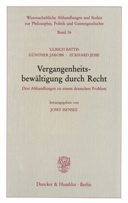 E. Jesse, "Entnazifizierung" und "Entstasifizierung" als politisches Problem. Die doppelte Vergangenheitsbewältigung - G. Jakobs, Vergangenheitsbewältigung durch Strafrecht? Zur Leistungsfähigkeit des Strafrechts nach einem politischen Umbruch - U. Battis, Aufbau des öffentlichen Dienstes in den neuen Bundesländern. Recht und Realität - J. Isensee, Der deutsche Rechtsstaat vor seinem unrechtsstaatlichen Erbe