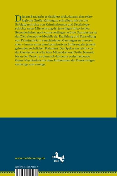Diesem Band geht es dezidiert nicht darum, eine teleologische Großerzählung zu schreiben, mit der die Erfolgsgeschichte von Kriminalroman und Detektivgeschichte unter Missachtung der jeweiligen historischen Besonderheiten nach vorne verlängert würde. Stattdessen ist das Ziel, alternative Modelle der Erzählung und Darstellung von Kriminalität in verschiedenen Gattungen zu untersuchen - immer unter dem konstitutiven Einbezug des jeweils geltenden rechtlichen Rahmens. Das Spektrum reicht von der klassischen Antike über Mittelalter und Frühe Neuzeit bis an den Punkt, an dem sich das heute vorherrschende Genre-Verständnis mit dem Aufkommen der Detektivfigur verfestigt und verengt.