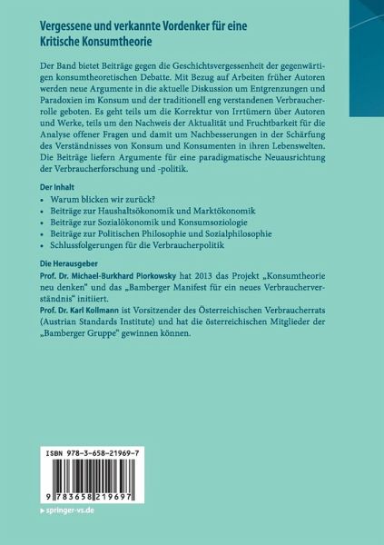 Die HerausgeberProf. Dr. Michael-Burkhard Piorkowsky hat 2013 das Projekt "Konsumtheorie neu denken" und das "Bamberger Manifest für ein neues Verbraucherverständnis" initiiert.Prof. Dr. Karl Kollmann ist Vorsitzender des Österreichischen Verbraucherrats (Austrian Standards Institute) und hat die österreichischen Mitglieder der "Bamberger Gruppe" gewinnen können.