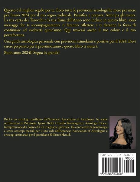 Questo è il miglior regalo per te. Ecco tutte le previsioni astrologiche mese per mese per l'anno 2024 per il tuo segno zodiacale. Pianifica e prepara. Anticipa gli eventi. La tua carta dei Tarocchi e la tua Runa dell'Anno sono incluse in questo libro, sono messaggi che ti accompagneranno, ti faranno riflettere e ti daranno la forza di continuare ad evolverti quest'anno. Qui troverai anche il tuo colore e il tuo portafortuna. Una guida astrologica personale con previsioni stimolanti e positive per il 2024. Devi essere preparato per il prossimo anno e questo libro ti aiuterà. Buon anno 2024!! Sogna in grande!