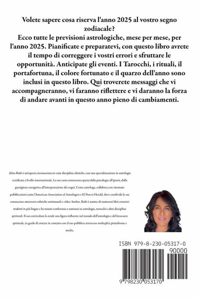Volete sapere cosa riserva l'anno 2025 al vostro segno zodiacale? Ecco tutte le previsioni astrologiche, mese per mese, per l'anno 2025. Pianificate e preparatevi, con questo libro avrete il tempo di correggere i vostri errori e sfruttare le opportunità. Anticipate gli eventi. I Tarocchi, i rituali, il portafortuna, il colore fortunato e il quarzo dell'anno sono inclusi in questo libro. Qui troverete messaggi che vi accompagneranno, vi faranno riflettere e vi daranno la forza di andare avanti in questo anno pieno di cambiamenti.